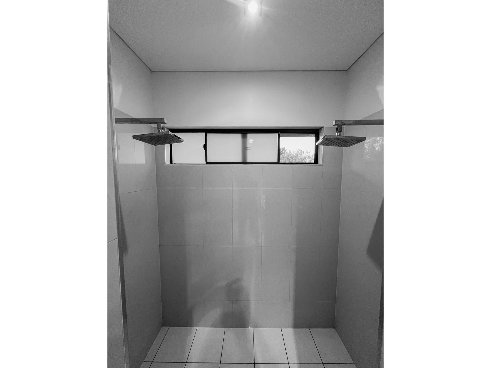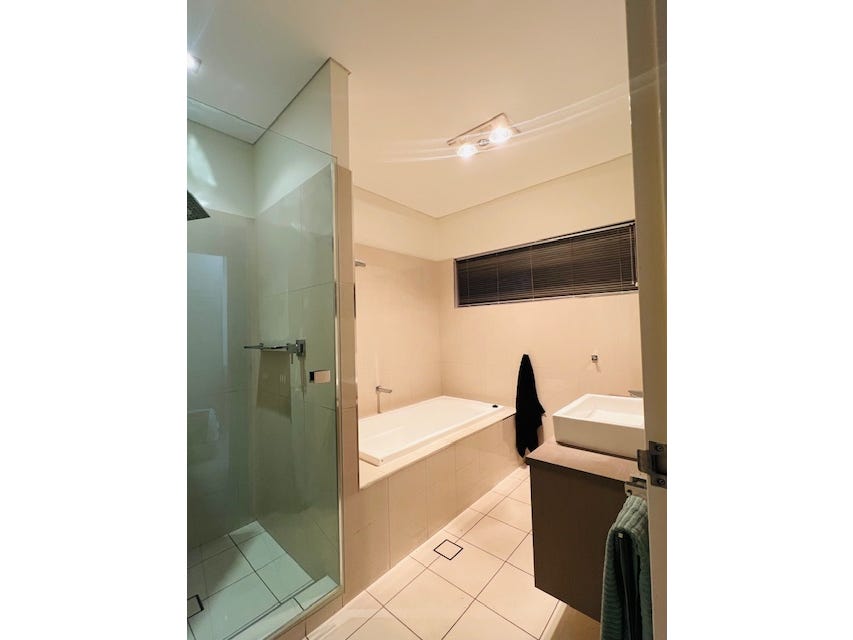 The central bathroom features a separate bath and shower, allowing you to choose your preferred relaxation method. It also includes a separate toilet and laundry area with additional storage and access to the outside, conveniently located in the middle for easy access from all bedrooms.