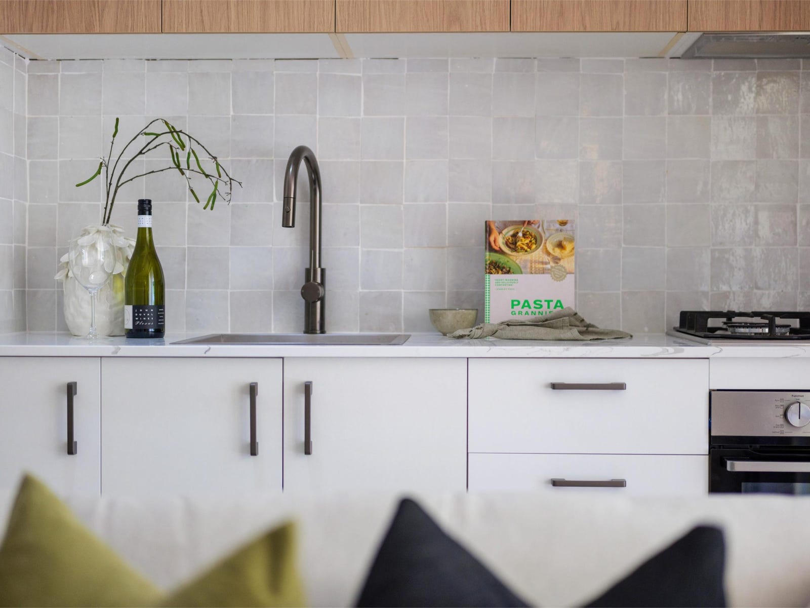Sleek kitchen with stone benchtops, tiled splashback, modern appliances and timber accents